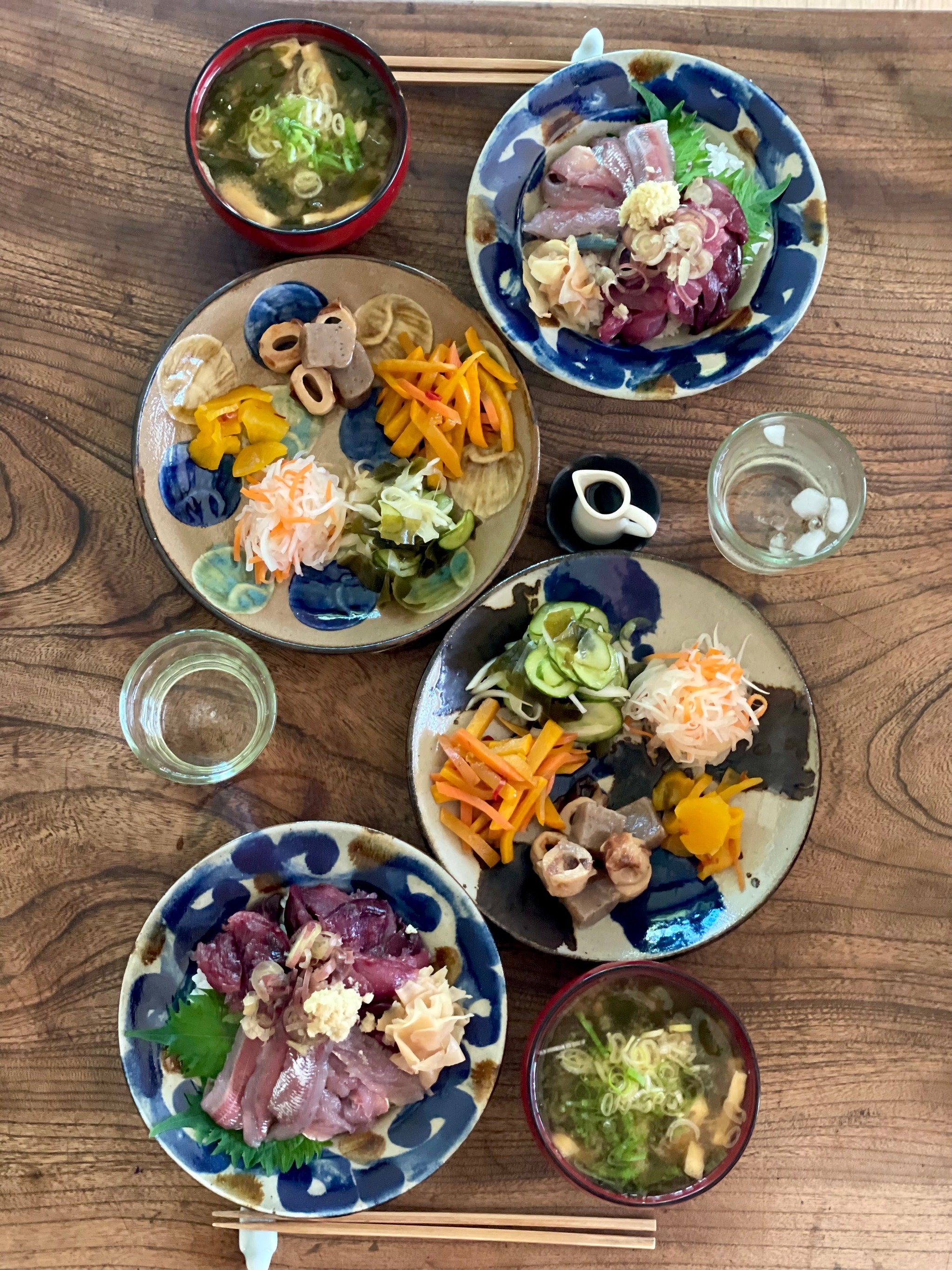 #お魚丼 #鰹 #うるめいわし #おうちごはん #遅めの朝ごはん #クハラチごはん #朝市ごはん #地元メシ #かつお丼 #いわし丼 #お味噌汁 #天然出汁 #おうち定食 #やちむん #深貝工房 #深貝公拓 #エドメ陶房 #室生窯 #琉球ガラス #魚を捌く