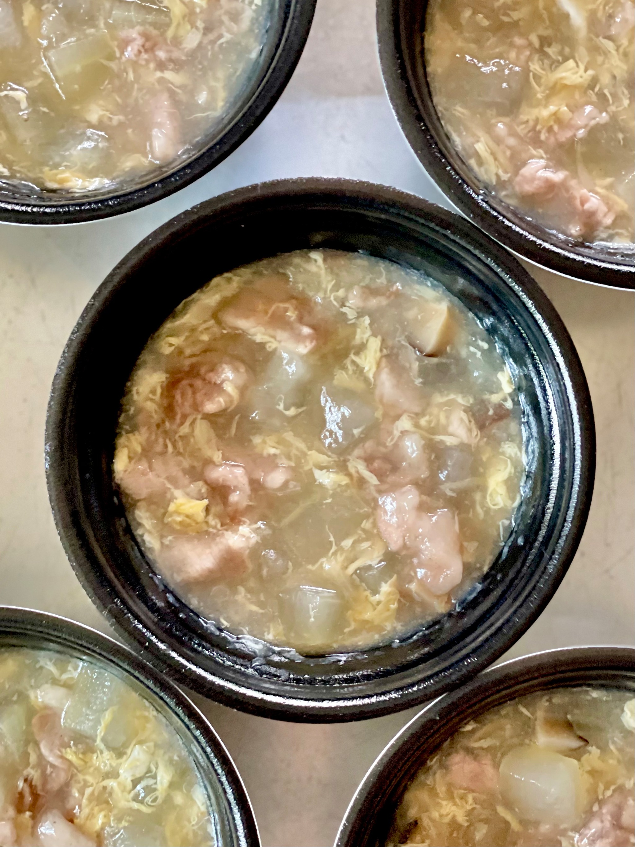 サイコロ状の冬瓜と干し椎茸、豚肉を煮込んで卵でとじた天然出汁のスープです。旬の冬瓜がとろりんとして美味でございますヨ。