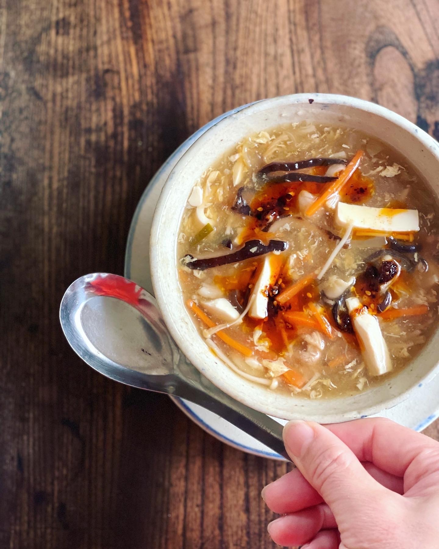 具沢山のほんのり酸っぱいスープです。自家製の辣油をお付けします。(ご予約の方は不要の場合お知らせ下さい。)